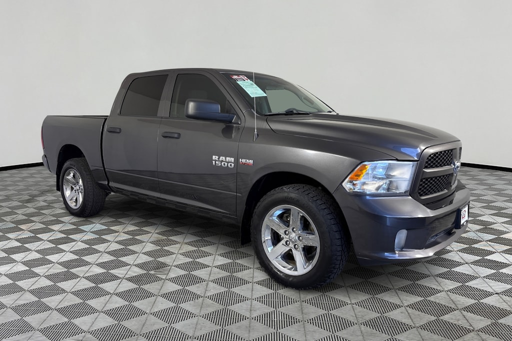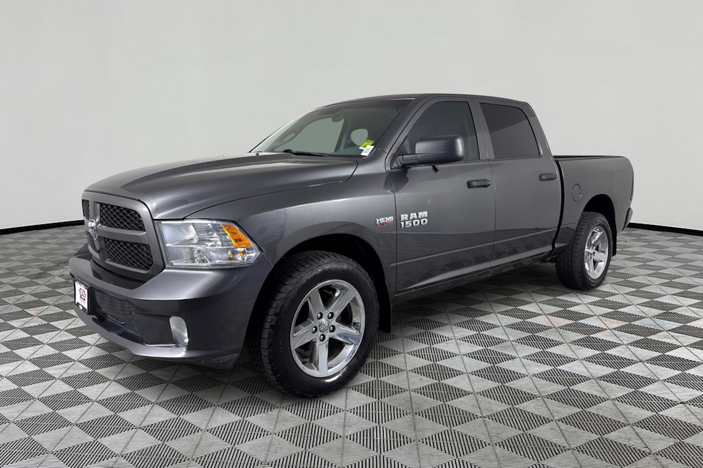 Granite Crystal Metallic Clearcoat exterior and Diesel Gray/Black interior, Express trim. EPA 21 MPG Hwy/15 MPG City! CD Player, iPod/MP3 Input, Back-Up Camera, 4x4, Aluminum Wheels, ADD CLASS IV RECEIVER HITCH, ENGINE: 5.7L V8 HEMI MDS VVT, TRANSMISSION: 8-SPEED AUTOMATIC (8HP7... EXPRESS VALUE PACKAGE, QUICK ORDER PACKAGE 26J EXPRESS, Hitch. AND MORE! KEY FEATURES INCLUDE 4x4, Back-Up Camera, iPod/MP3 Input, CD Player, Aluminum Wheels Privacy Glass, Child Safety Locks, Heated Mirrors, Electronic Stability Control, Electrochromic rearview mirror. OPTION PACKAGES EXPRESS VALUE PACKAGE Radio: Uconnect 3 w/5 Display, 5.0 Touchscreen Display, SiriusXM Satellite Radio, No Satellite Coverage w/HI/AK/PR/VI/GU, For More Info, Call 800-643-2112, Charge Only Remote USB Port, Integrated Voice Command w/Bluetooth®, Rear View Day/Night Mirror, Overhead Console, GPS Antenna Input, Temperature & Compass Gauge, Rear Floor Mats, Front Floor Mats, Wheels: 20 x 8 Aluminum Chrome Clad, Full Size Temporary Use Spare Tire, Tires: P275/60R20 BSW AS, Remote Keyless Entry w/All-Secure, QUICK ORDER PACKAGE 26J EXPRESS Engine: 5.7L V8 HEMI MDS VVT, Transmission: 8-Speed Automatic (8HP70), Front Fog Lamps, GVWR: 6,900 lbs, Rear Floor Mats, Front Floor Mats, Body Color Front Fascia, Body Color Grille, Body Color Rear Bumper w/Step Pads, Ram 1500 Express, ENGINE: 5.7L V8 HEMI MDS VVT Electronically Controlled Throttle, Heavy Duty Engine Cooling, Next Generation Engine Controller, Engine Oil Heat Exchanger, Hemi Badge, Heavy Duty Transmission Oil Cooler, TRANSMISSION: 8-SPEED AUTOMATIC (8HP70) 17 Aluminum Spare Wheel, ADD CLASS IV RECEIVER HITCH. Ram Express with Granite Crystal Metallic Clearcoat exterior and Diesel Gray/Black interior features a 8 Cylinder Engine with 305 HP at 6400 RPM*. EXPERTS RAVE KBB.com explains . the 2018 Ram 1500 is an extremely capable and comfortable full-size pickup thats ready to work, tow or play.. Great Gas Mileage: 21 MPG Hwy. AFFORDABILITY AutoCheck One Owner Reduced from $26,995. This 1500 is priced $1,900 below Kelley Blue Book. Approx. Original Base Sticker Price: $37,200*. .